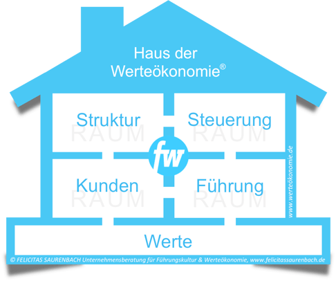 Mit dem HAUS DER WERTEÖKONOMIE® haben wir einen Managementansatz entwickelt, der die Perspektiven Kunden, Struktur, Steuerung und Führung werteökonomisch vernetzt. Die Entwicklung von Führungsgrundsätzen ohne Vernetzung der vier Räume und ohne Übersetzung in konkretes Führungsverhalten ist unzureichend. Wir schärfen den Blick für das Gesamtbild.